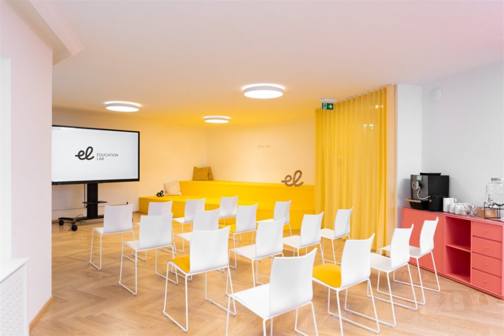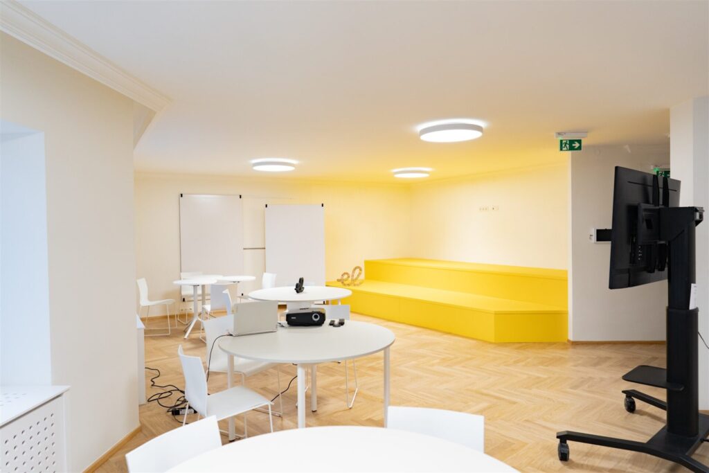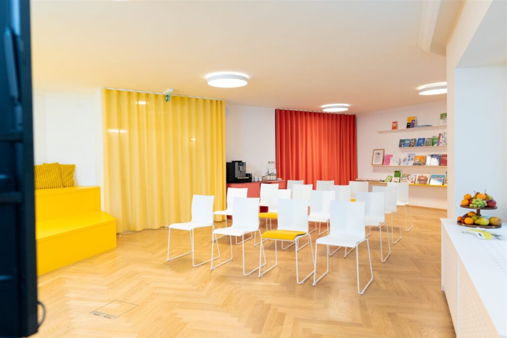 Ein Raum, der zum Lernen und gemeinsamen Denken und Schaffen einlädt. Zwei große Holzstufen laden zum Sitzen ein, die Bücherwand sorgt für Atmosphäre und Inhalt – kombiniert mit funktionaler Ausstattung wie interaktivem Screen, Whiteboards und Moderationsmaterial. Perfekt für Weiterbildungen, Gruppenarbeiten oder inspirierende Lernformate.
